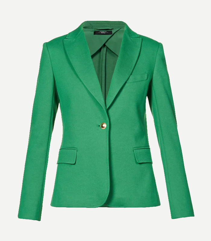 - Collar: Wide notch lapel