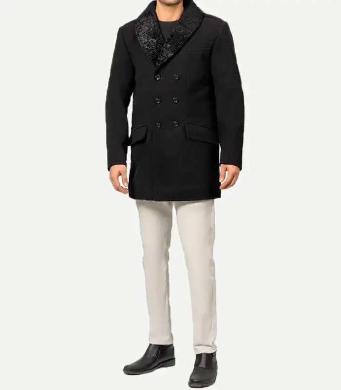 Brewer Mens Black Fur Collar Wool Coat – Mens Winter Peacoat