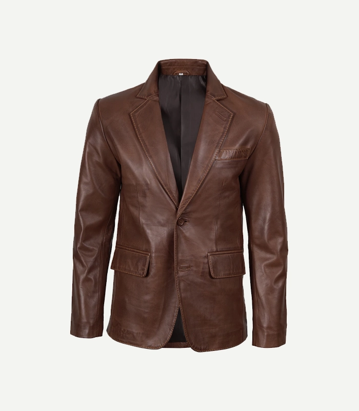 Mens Two Button Notch Lapel Cognac Leather Blazer