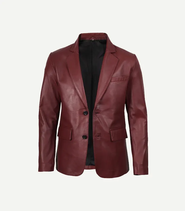 Mens Two Button Notch Lapel Maroon Leather Blazer